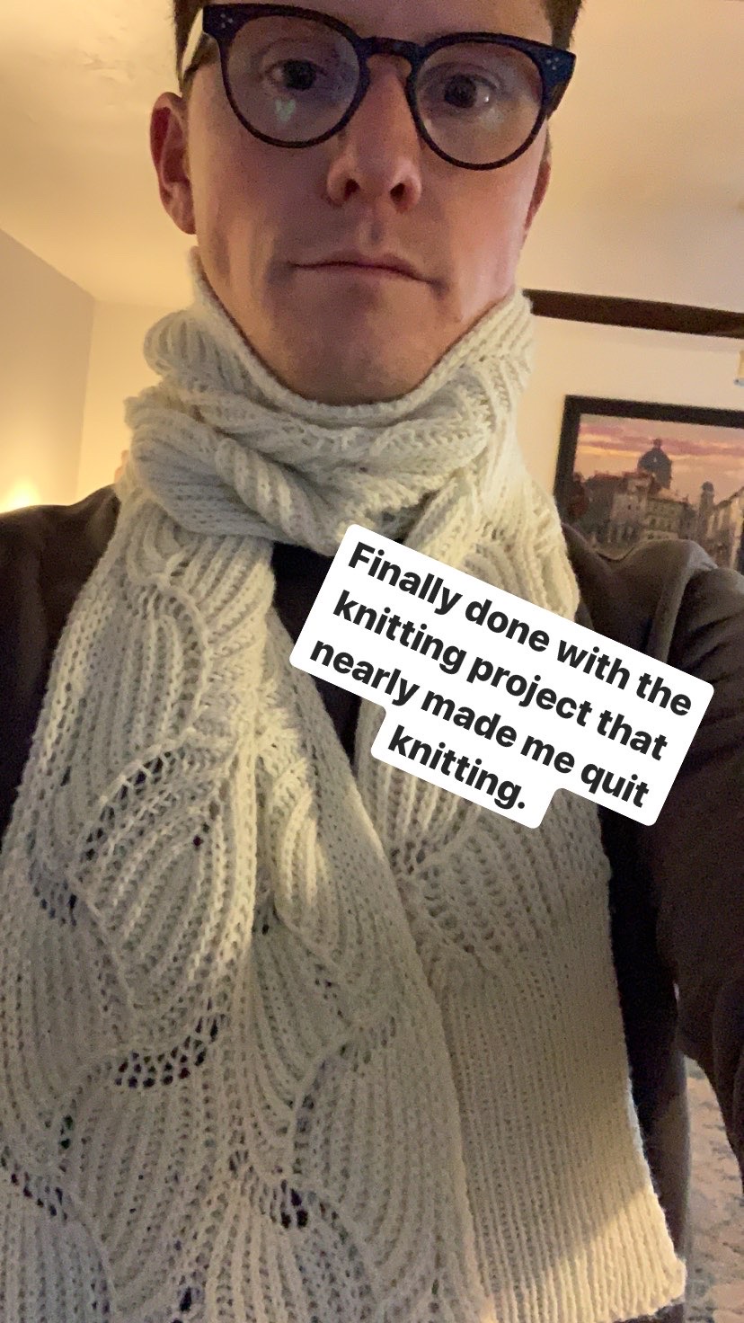 Anyway. You'll recall I was working on this scarf that was eleventy thousand percent over my head. I had fooled myself into thinking I could do anything. No task was too big for this guy. I channeled my inner-participation-trophy-loving-coddled-millennialism and determined I was too big to fail! (Not a fat joke.)