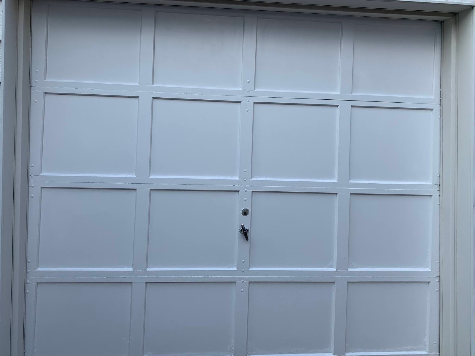 So I bought a small can of primer and a small can of white paint and eleventy thousand hours later I had completed most of the project. Here's a picture of the garage door to prove it: